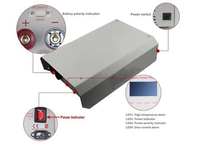 4. When charging current over 100A or charger out-put voltahe over 15V, this charger will cut-off out-put and light LED3, show(large charging) or (high voltahe)