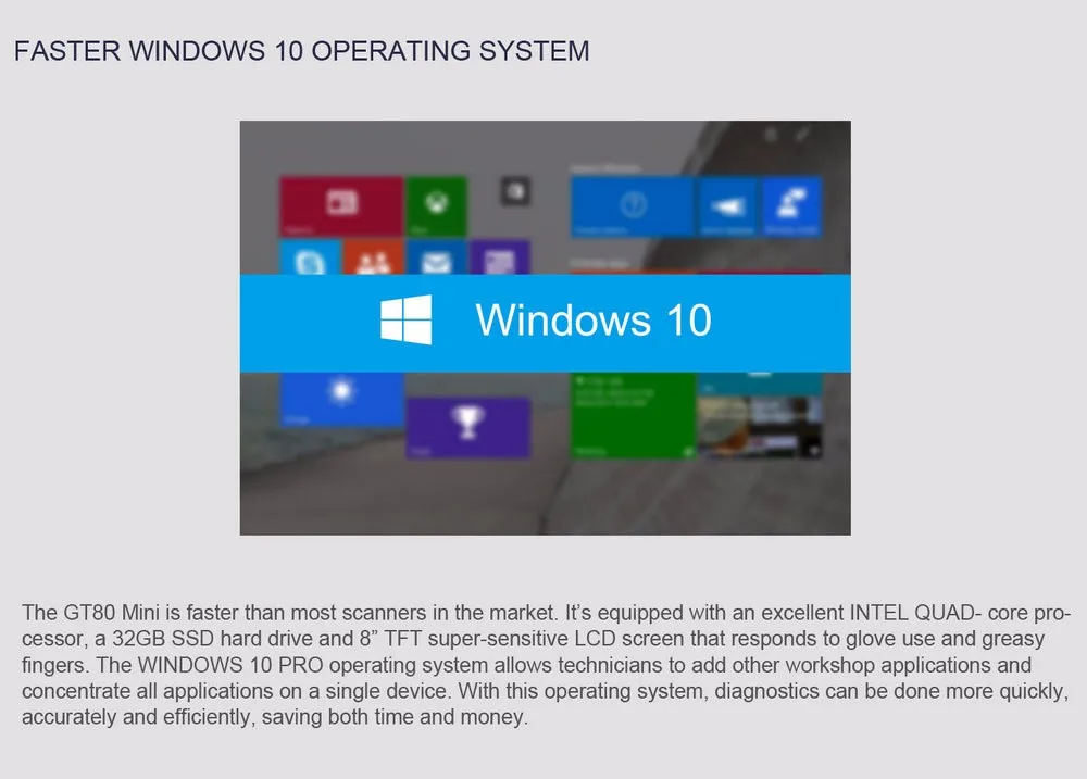 The GT80 Mini is faster than most scanners in the market. It's equipped with an excellent INTEL QUAD-core pro cesser, a32GB SSD hard drive and8" TFT super-sensitive LCD screen that responds to glove use and greasy fingers. The WINDOWS10 PR0 operating system allows technicians to add otherworkshop applications and