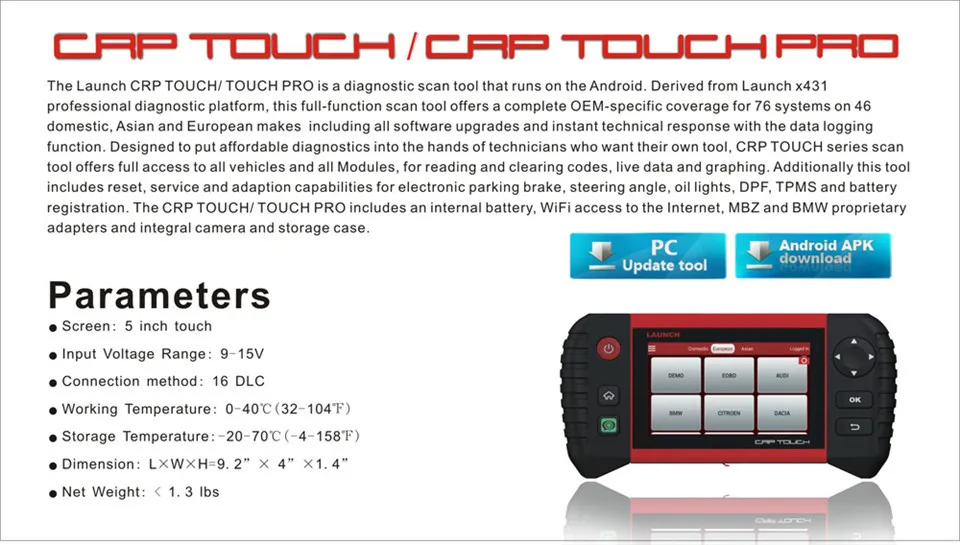 The Launch CRP TOUCH/ TOUCH PRO is a diagnostic scan tool that runs on the Android. Derived from Launch x431 professional diagnostic platform, this full-function scan tool offers a complete OEM-specific coverage for 76 systems on 46 domestic, Asian and European makes including all software upgrades and instant technical response with the data logging function. Designed to put affordable diagnostics into the hands of technicians who want their own tool, CRP TOUCH series scan tool offers full access to all vehicles and all Modules, for reading and clearing codes, live data and graphing. Additionally this tool includes reset, service and adaption capabilities for electronic parking brake, steering angle, oil lights, DPF, TPMS and battery registration. The CRP-229 includes an internal battery, WiFi access to the Internet, MBZ and BMW proprietary adapters and integral camera and storage case.