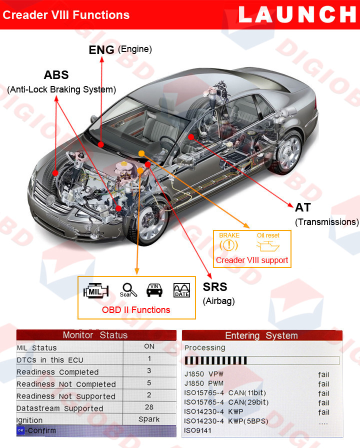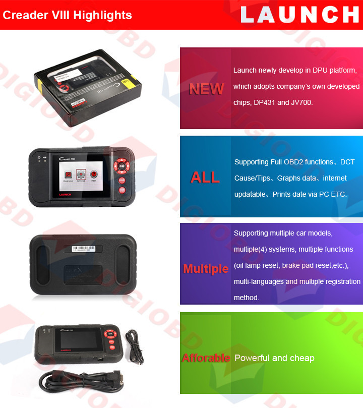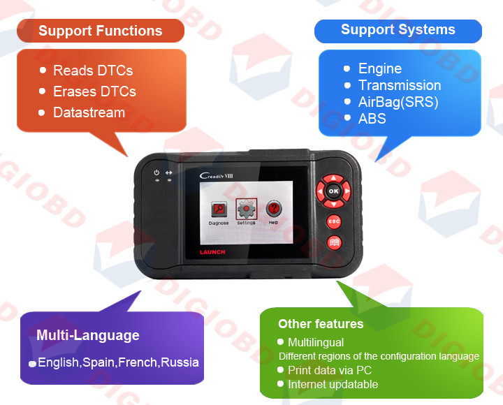 Launch CRP129 Creader VIII is a well built comprehensive diagnostic instrument by Launch. It's not only including full function of OBDII /EOBD, but also support more functions of four systems (Engine, automatic transmission, anti-lock braking system and airbag) of main car models, such as read and reset code, multi-languages, data stream graphic display, storage and playback of dynamic data stream, and able to provide special functions, such as engine oil light reset, reset brake block, correct steering angle sensor.